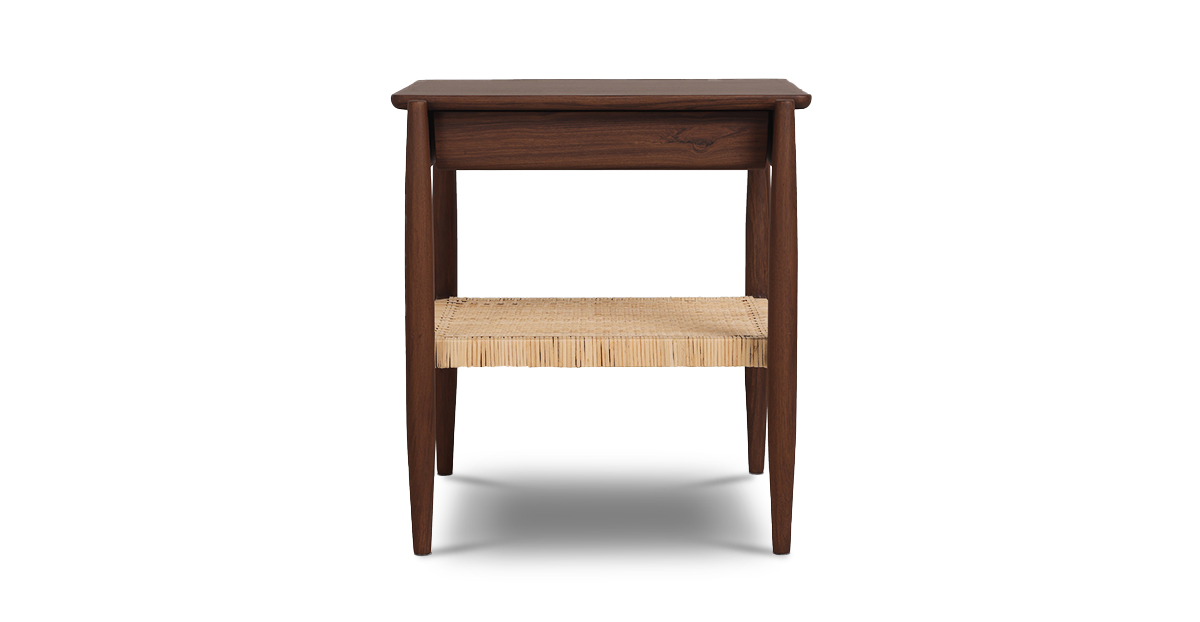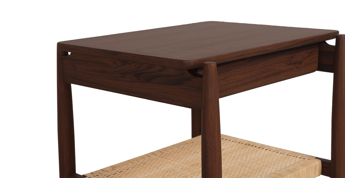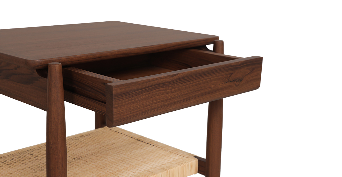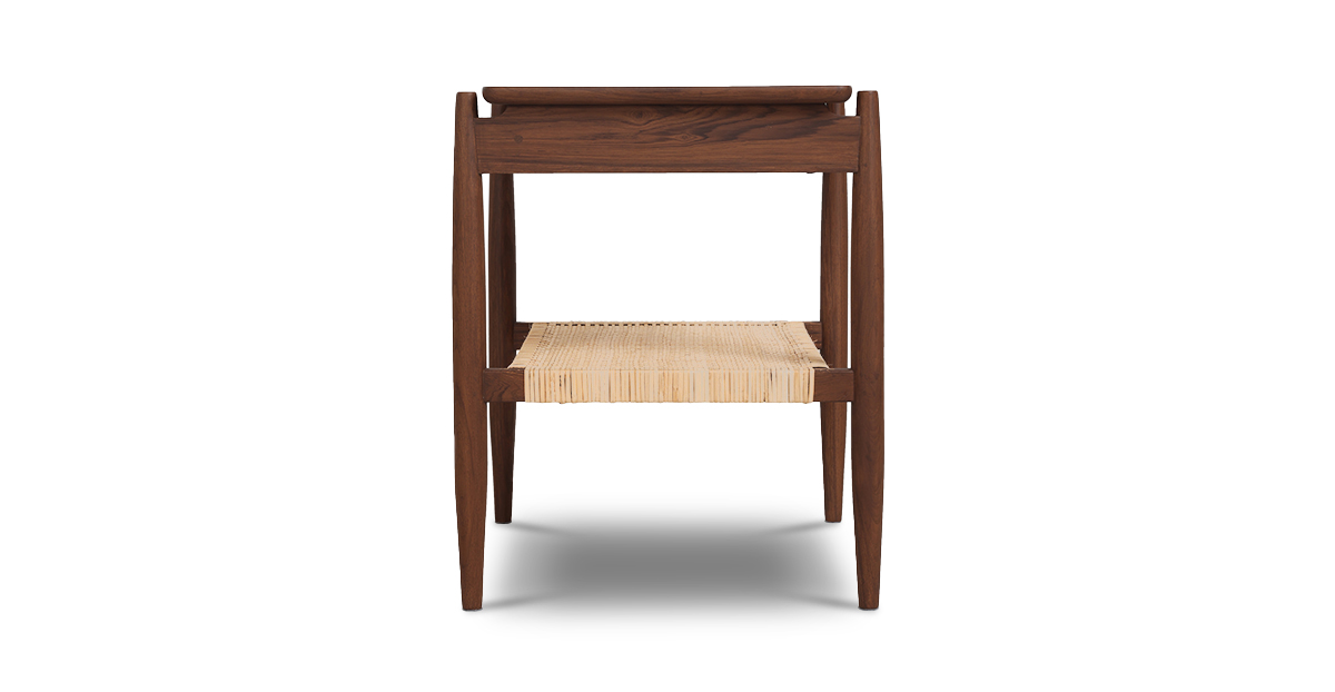 The versatile Elda Side Table is beautifully crafted in solid teak wood with a teak veneer top. It features a slim drawer for essentials and a bottom shelf in natural handwoven cane for added flair. It’s sleek design and beautifully curved legs bring a touch of sophistication to both bedside and living room settings.