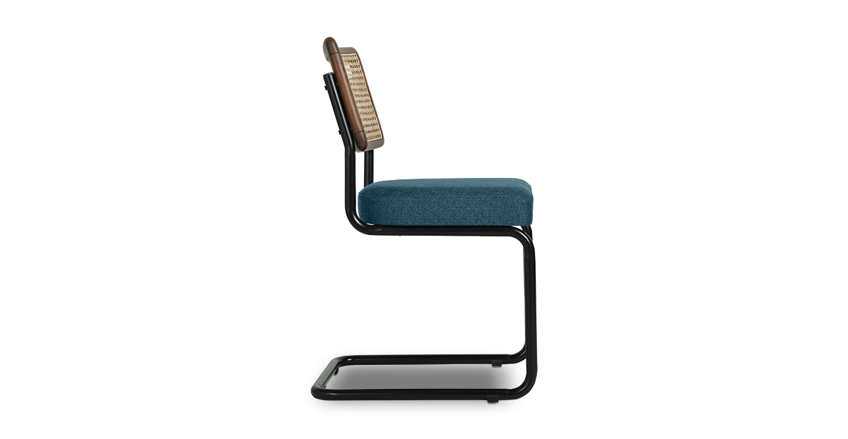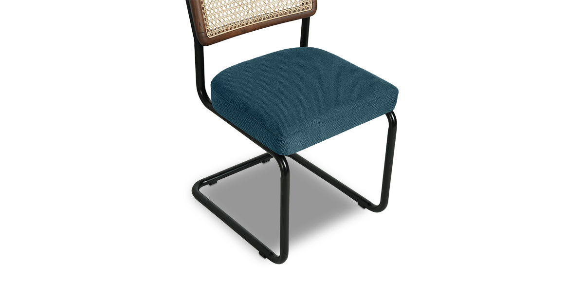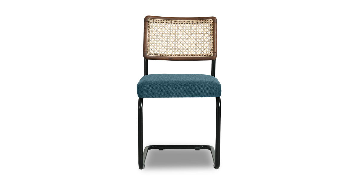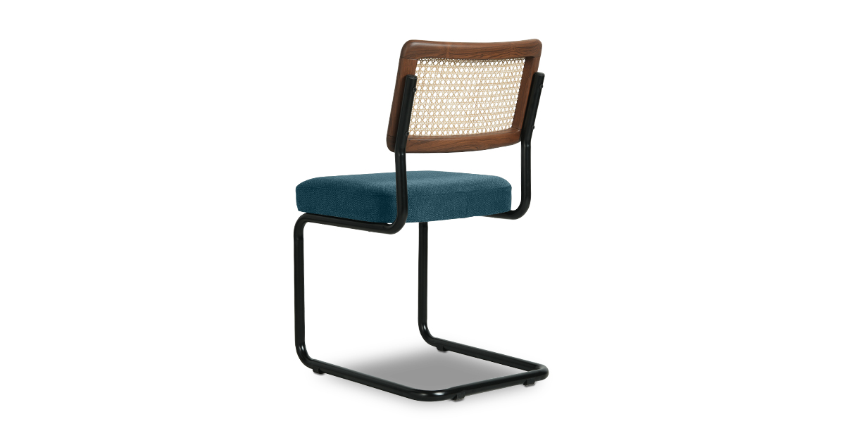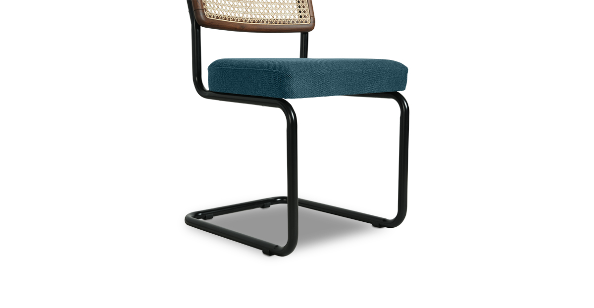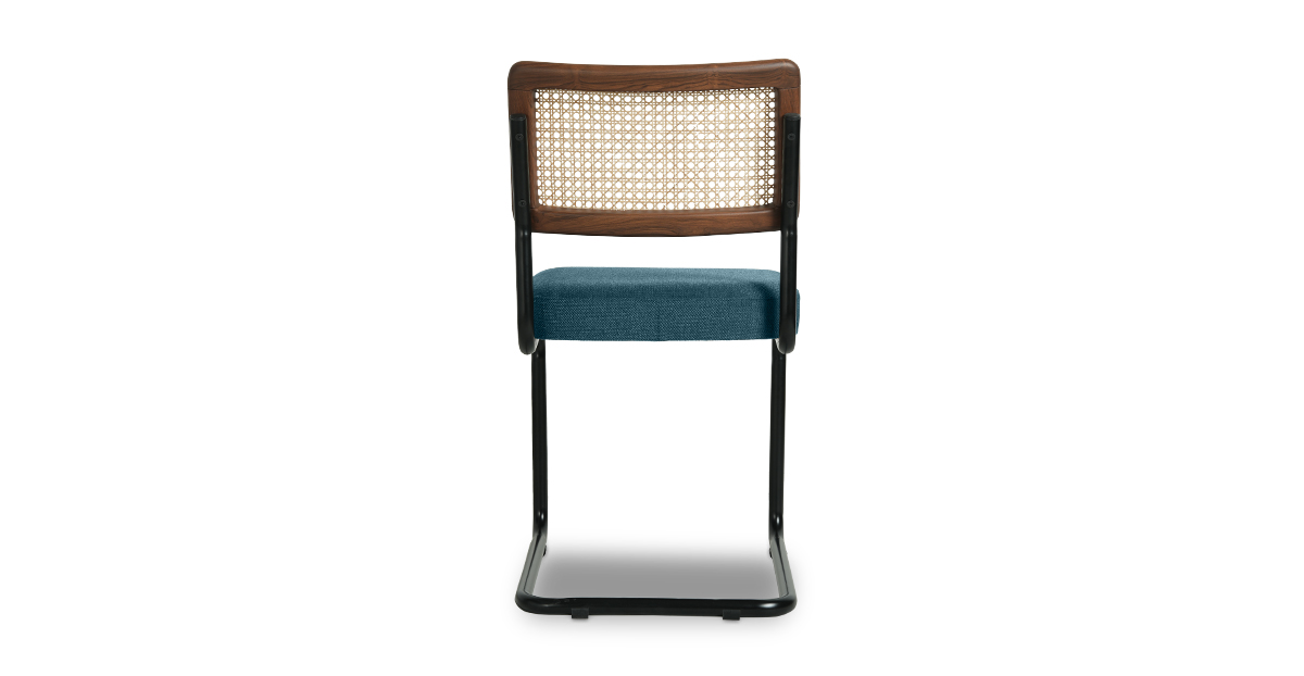 Perfect for long hours at the dining table or study, the Halden Chair is constructed with a metal base, teakwood back with handcrafted rattan work and an upholstered seat for comfort. Based on the iconic Cesca, it epitomises mid-century modern charm.