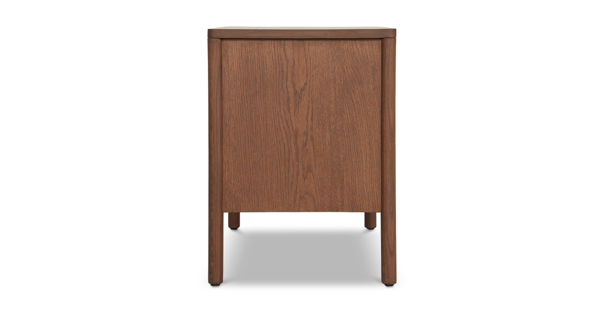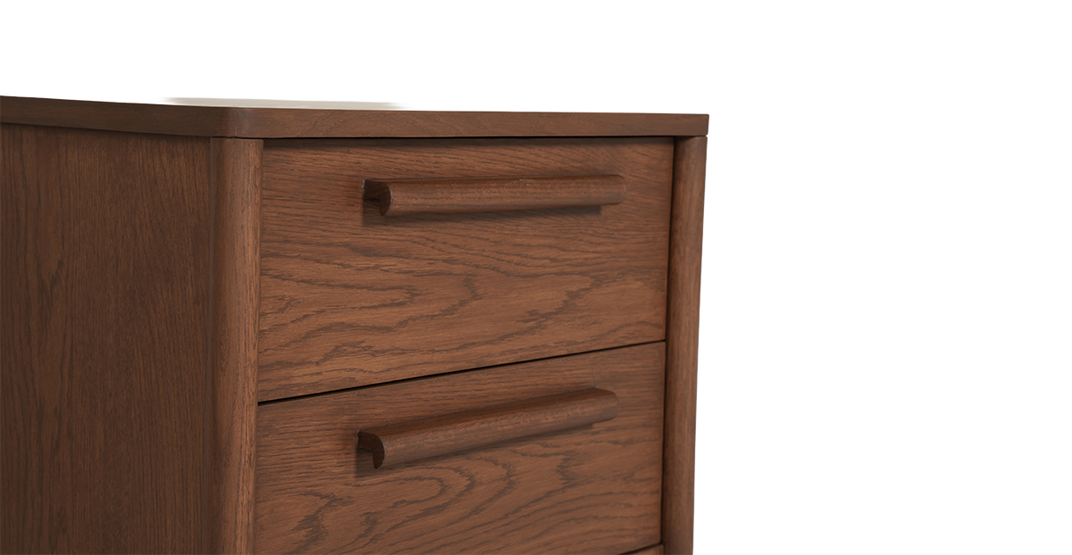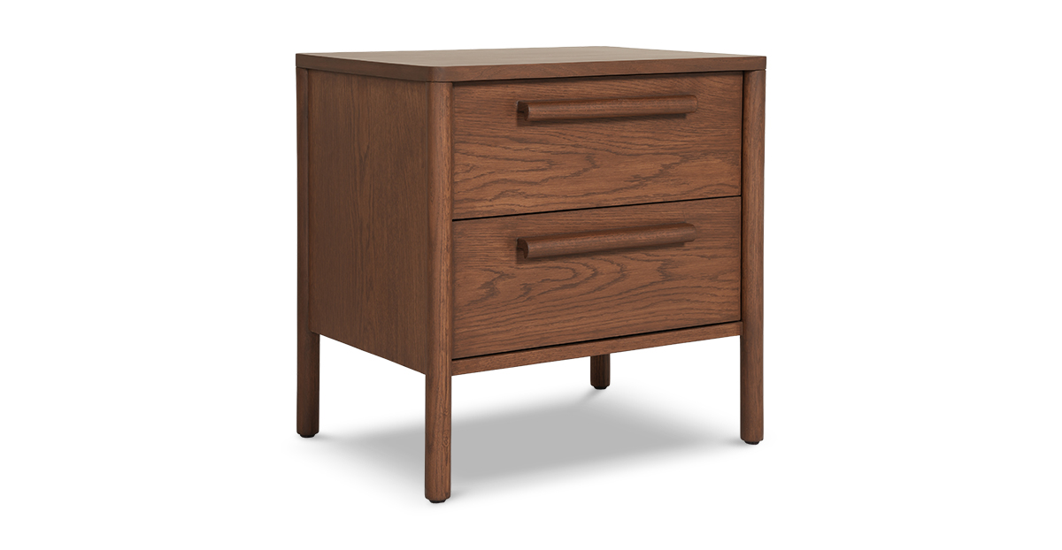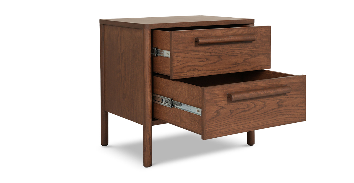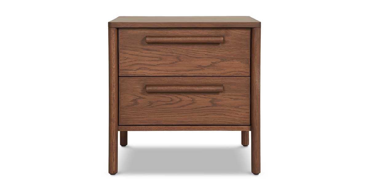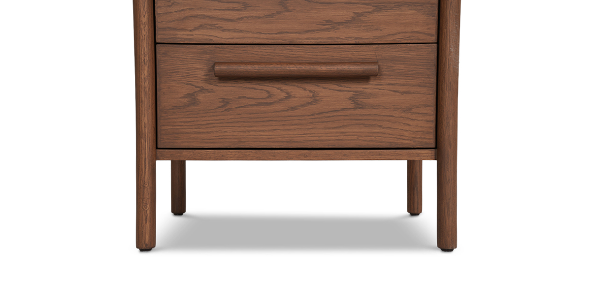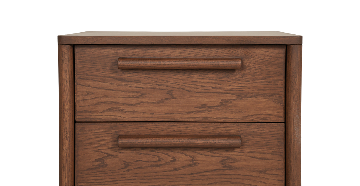 Crafted in beautiful open grain oak wood and veneer with a warm teak finish, the Lagos side table flaunts softly rounded legs and matching wood handles for a touch of retro charm. With two spacious drawers and smooth channels, itβs got room for all your secretsβand then some.