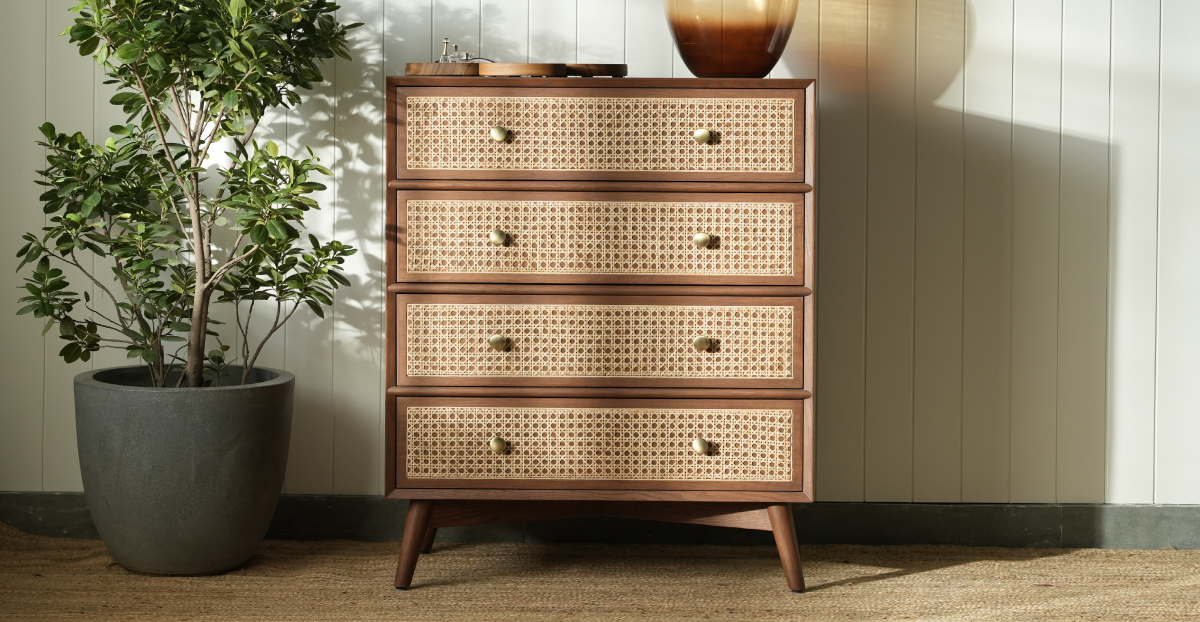₹44,999The Aby tall dresser brings cheerful charm to any room. Crafted in oak veneer and wood with a warm teak finish, it offers four roomy soft-close drawers for clothes, games and little treasures. Natural rattan fronts add breezy personality, making everyday storage feel stylish, effortless, and a bit more joyful.