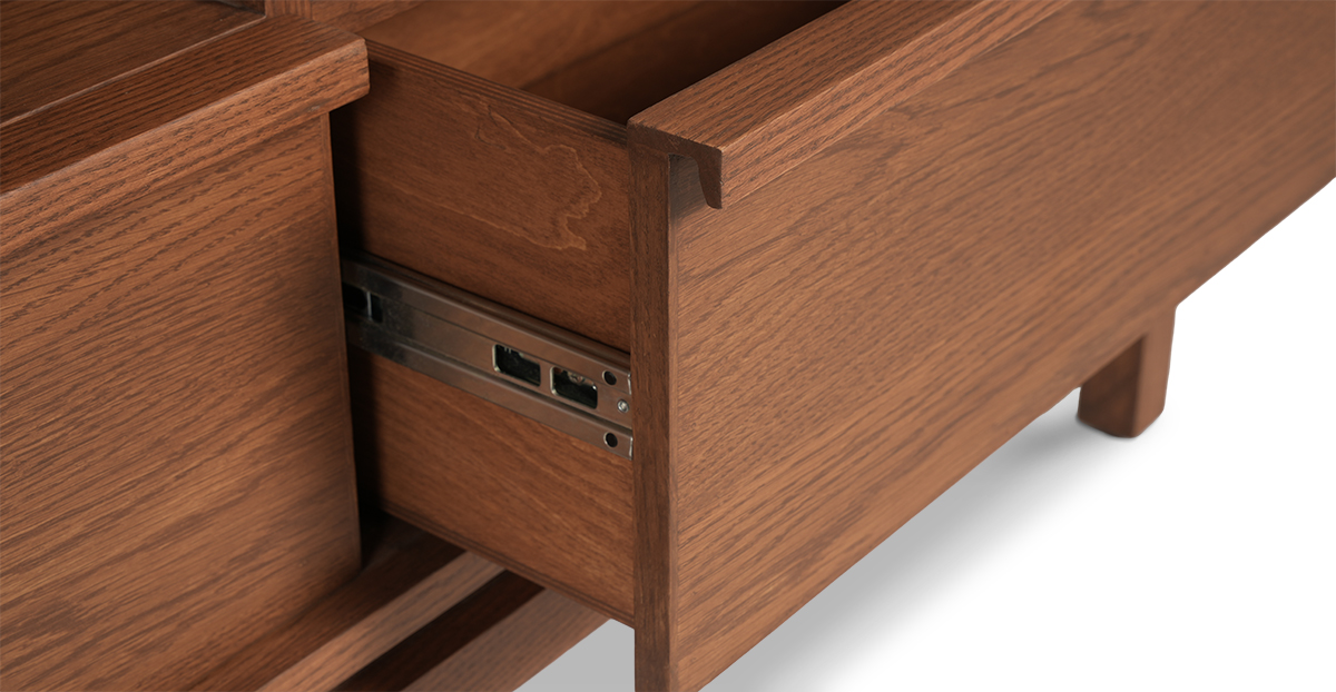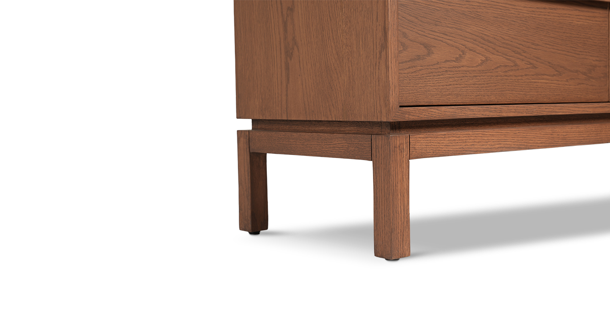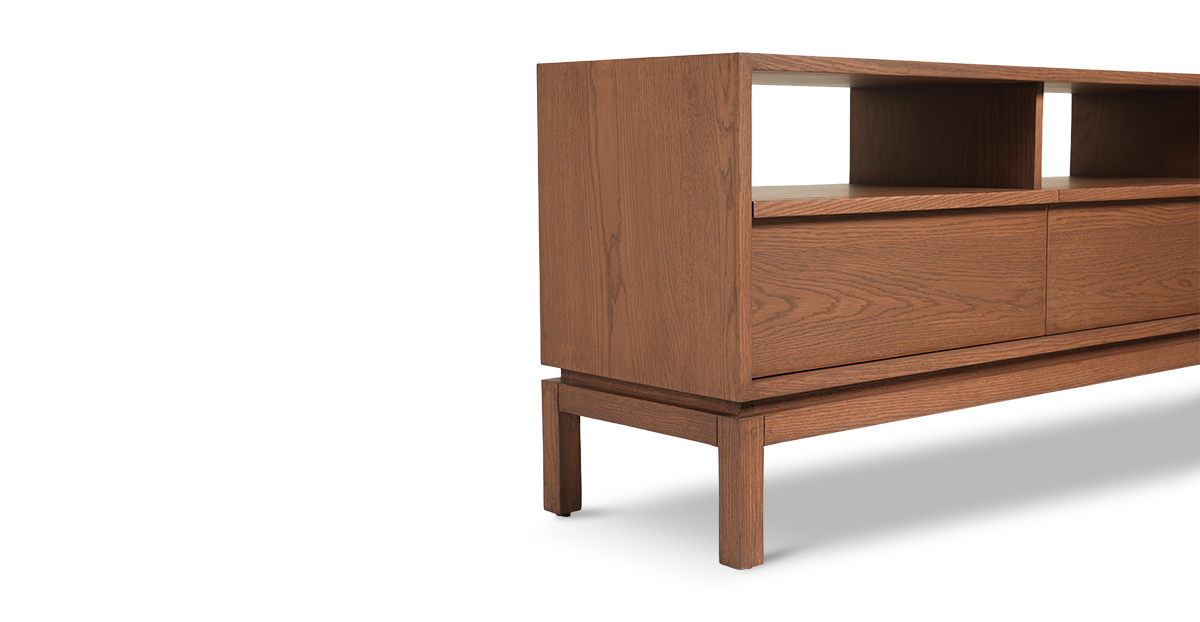 Crafted in oak wood and veneer with a warm teak finish, the Toleda media unit features sturdy legs connected by a subtle groove detail that adds depth to it’s design. Three open shelves keep your gadgets or decor handy, while three roomy drawers with built-in wood handles neatly tuck away everything else — all style, no clutter.