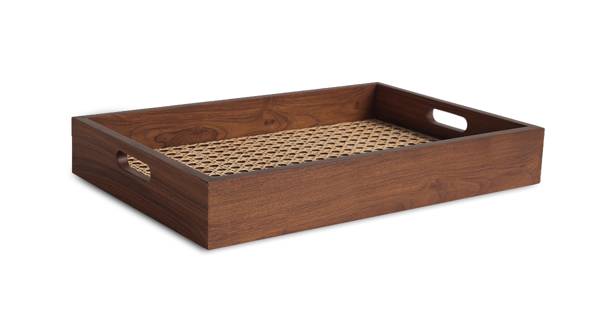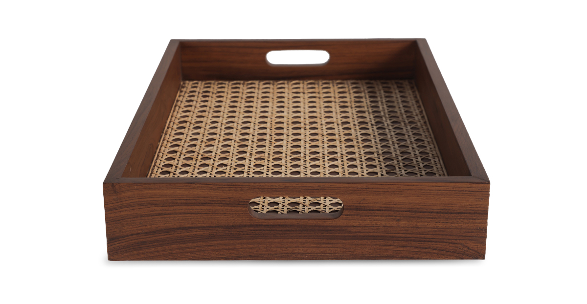 Crafted in teak with a natural cane weave, the Vari Serving Tray features convenient cutouts for easy handling. Elevate your entertaining game with this stylish and handy party essential which also makes for a thoughtful housewarming gift!